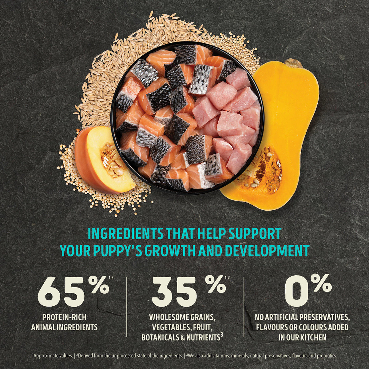Get obsessed with protein-rich animal ingredients and fibre-rich wholesome grains in ACANA™ Healthy Grains™! Our ACANA Healthy Grains Puppy Sea & Farm Recipe is a poultry-free recipe specially crafted to support your puppy’s development with raw wild-caught salmon and Yorkshire pork. It’s also balanced with healthy grains in the form of oats, sorghum and millet. These grains are high in fibre and gluten-free, offering added nutrition that helps support a healthy digestive environment. Our Puppy Sea & Farm Recipe is crafted with 65% protein-rich animal ingredients* balanced with 35% wholesome grains, vegetables, fruit, botanicals and nutrients**. Plus, it helps support key health benefits for your puppy including Brain Development and Muscle and Bone Development. Help support your puppy’s growth and development with a nutritious and delicious protein-rich food.