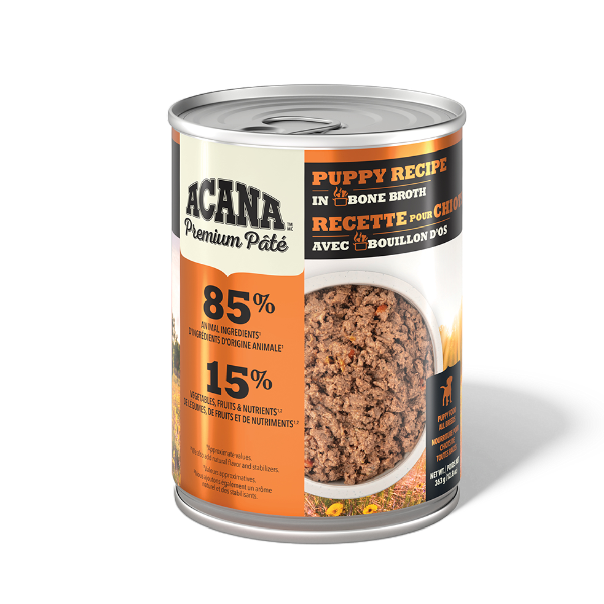 Every can of ACANA™ Premium Chunks is crafted thoughtfully from start to finish. Our Puppy Pâté Recipe in Bone Broth is a specially formulated pâté crafted to nurture your puppy’s growth and development. With 85%* premium animal ingredients like chicken, turkey and herring, it’s balanced with 15%*† visible fruit and vegetables. Our recipe is also in a savoury bone broth base for flavour and nutrition. Top it on your puppy’s favourite ACANA kibble to provide moisture and nourishment, or feed it alone for an indulgent treat at mealtime.