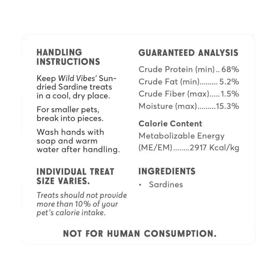 Wild Vibes’ Sun-dried Sardine treats will have your pet hooked! These are a great protein source, and are full of omega-3 fatty acids. What’s more, sardines also have Vitamin D, Calcium, Vitamin B-12 and the antioxidant selenium. Being low on the food chain and feeding on plankton, sardines are among the safest, healthiest ocean foods for your pet. Ideal for a bite sized snack, or a high value training treat, we know that your pet will love these delicious morsels.